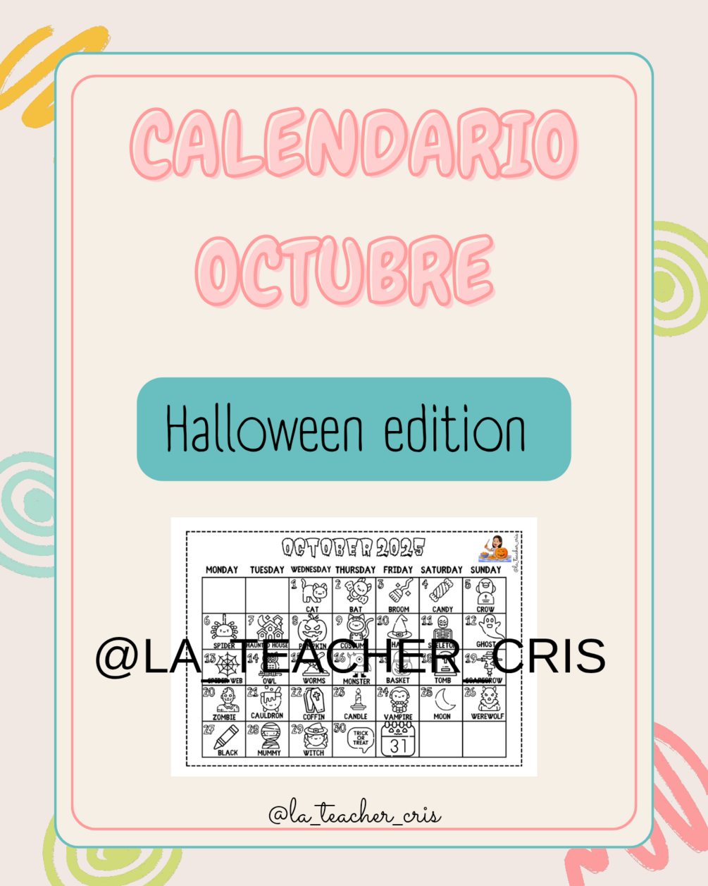 Calendario de octubre 2025 para aprender cada día una palabra de vocabulario relacionado con Halloween.